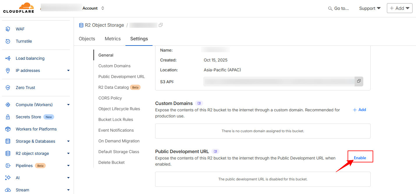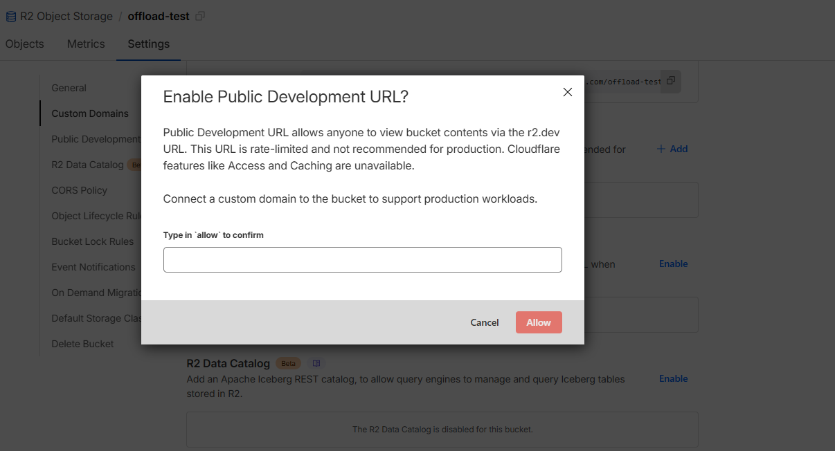 Click “Enable” to grant access to your public development URL, allowing anyone to view the bucket contents via the R2.dev link.