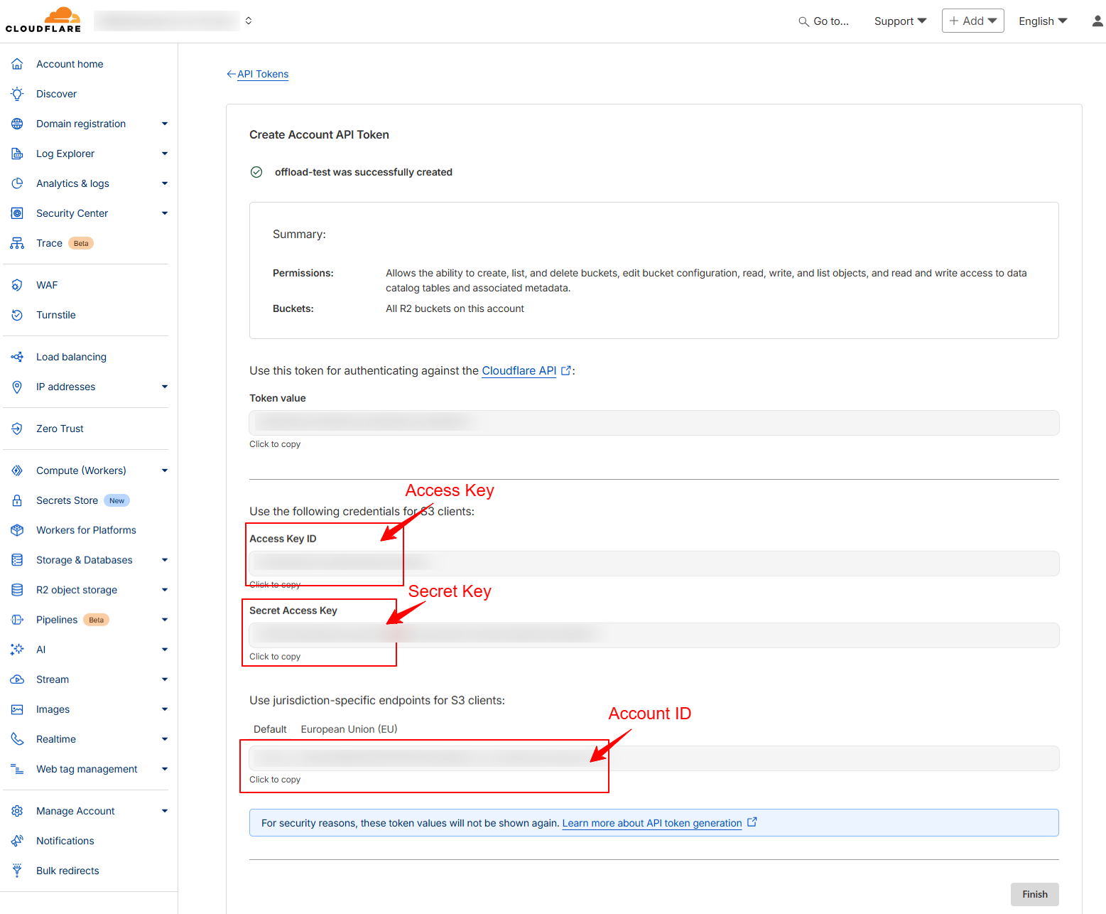 Here, you will find the Accound ID, Access Key and Secret Key. Be sure to copy them right away, as you will not be able to access this page again later