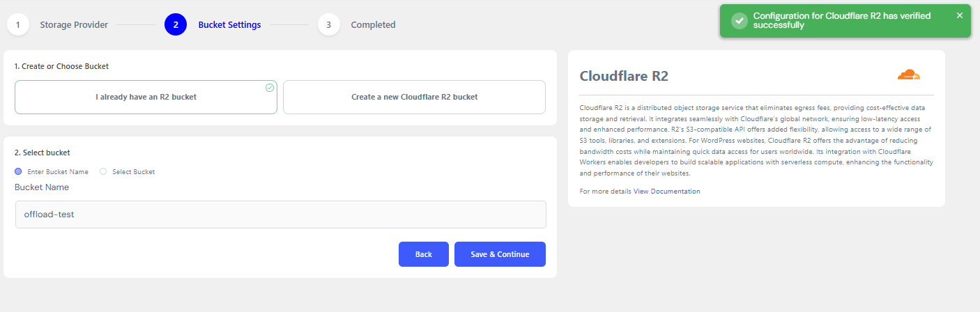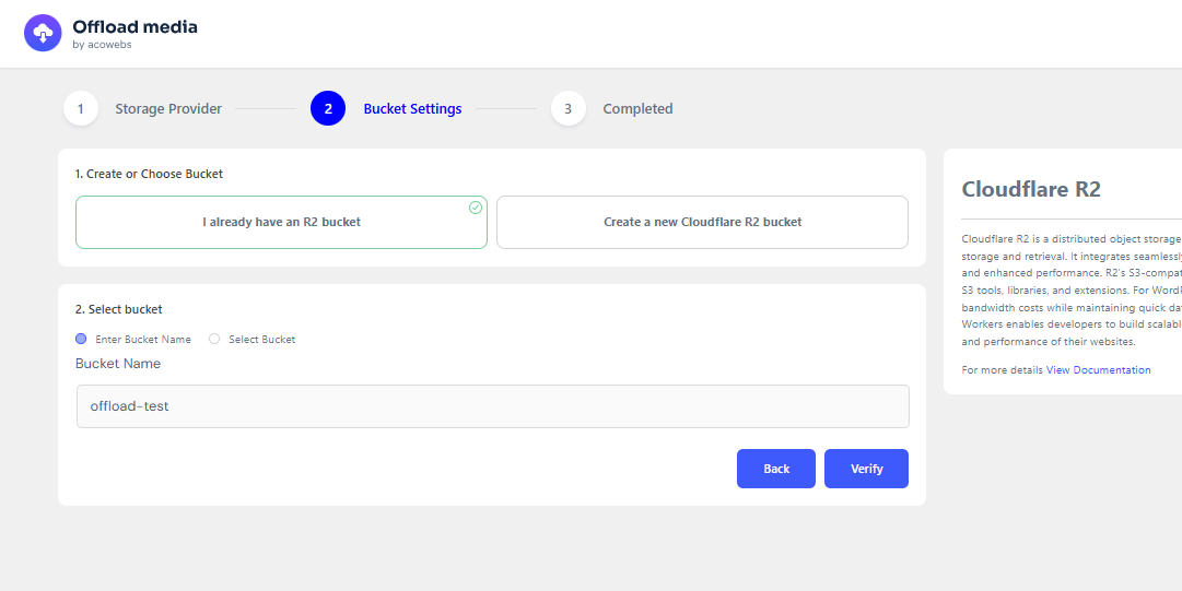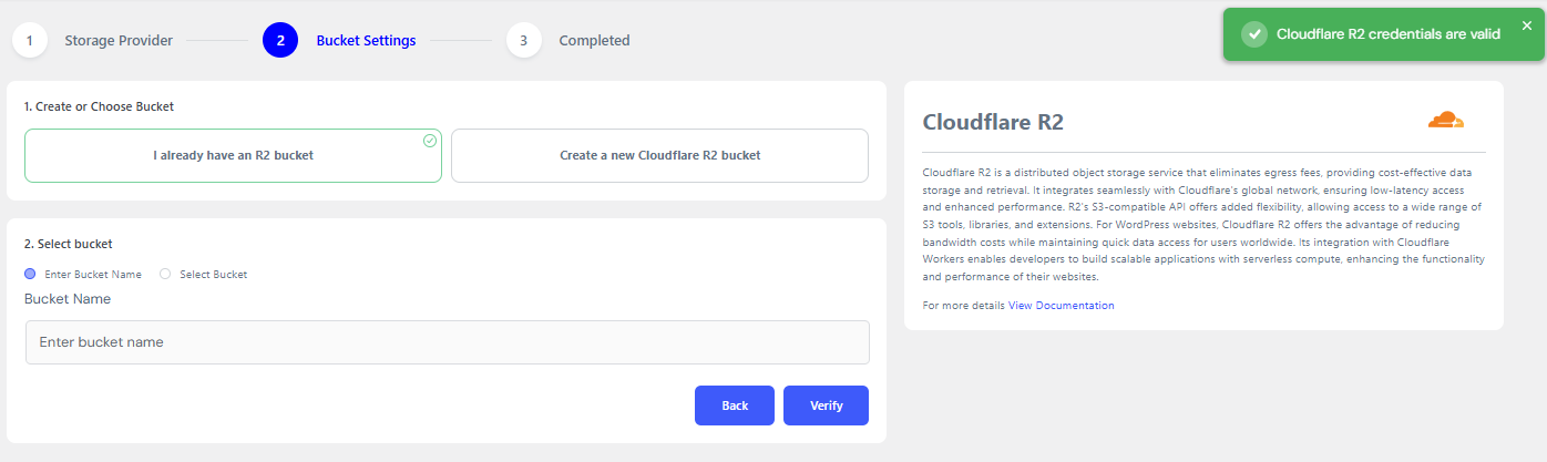 Here, you need to choose “I already have an R2 bucket “ as the “ Create or Choose Bucket “ option and then enter the bucket name that we created earlier. Once done..Click verify