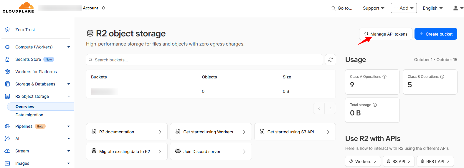 For creating Access key and secret key, return to your Cloudflare Dashboard >> navigate to R2 Object Storage Overview, click on “ Manage API tokens “ from the window .