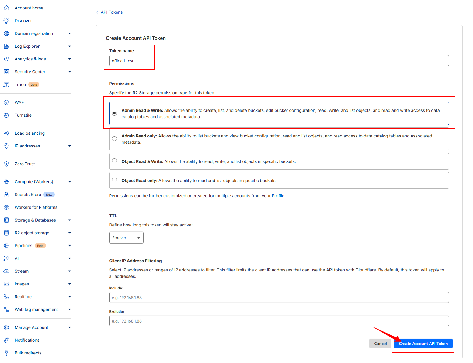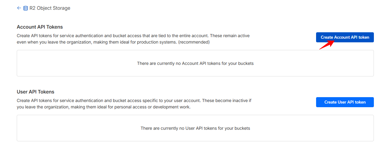 This will redirect you to the R2 API page. Click the “ Create Account API Token “ button to begin creating your API token