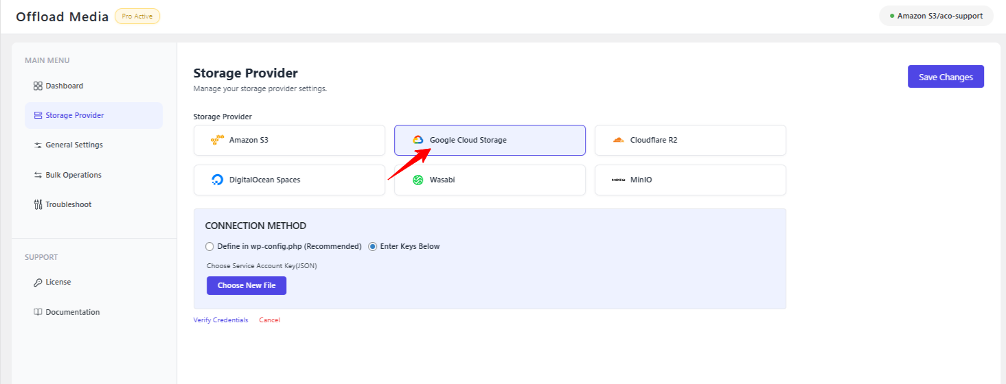 After successfully installing the plugin, go to the WordPress admin dashboard and select: Offload Media >> Storage provider