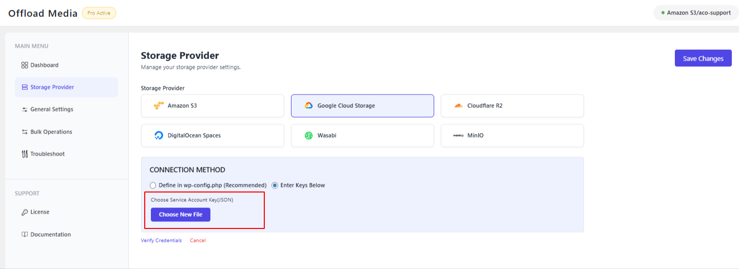 Here, we will click ‘Enter Keys Below’ to upload the previously downloaded Google Cloud JSON key file.