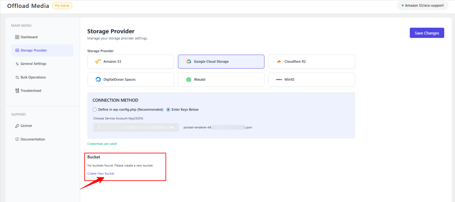 Once you have selected or created the bucket, click “Save Changes.”