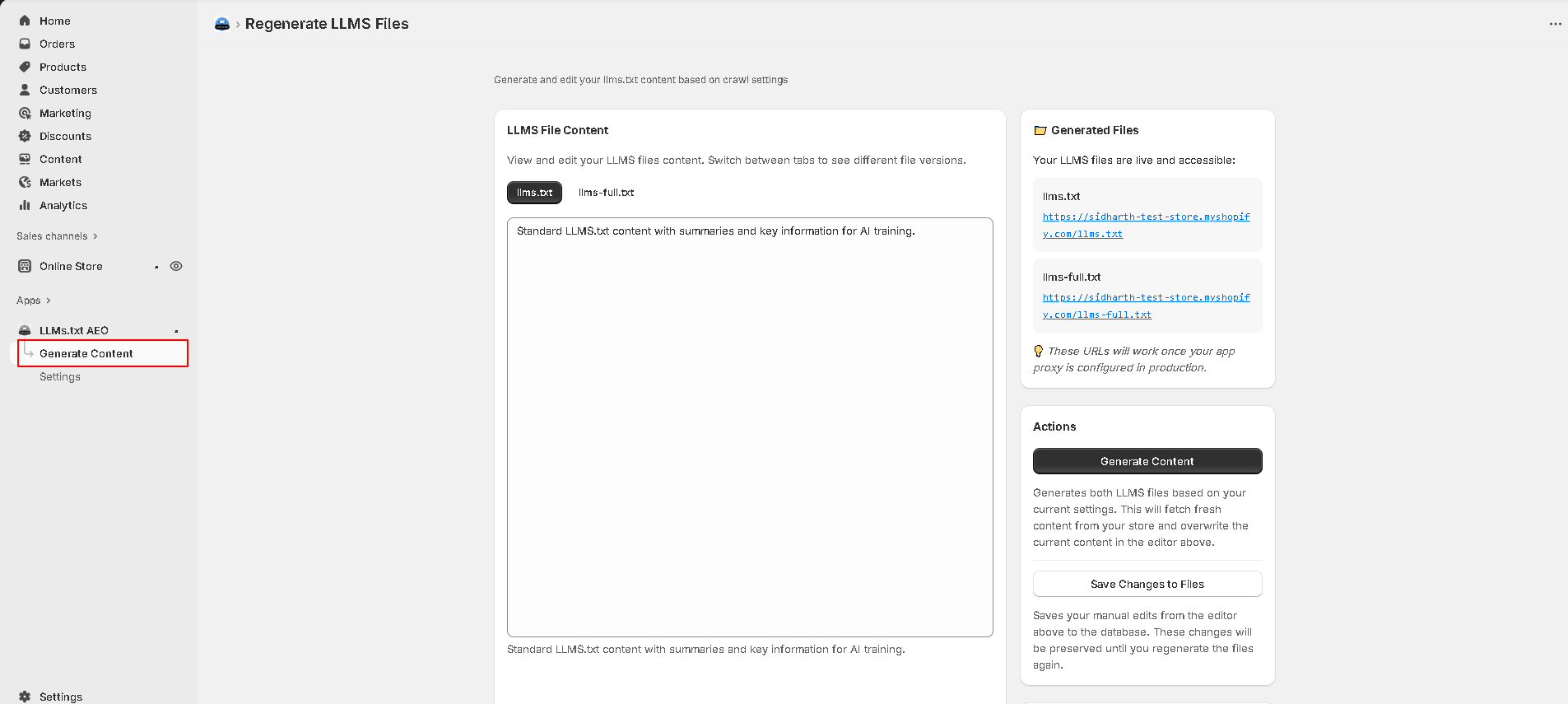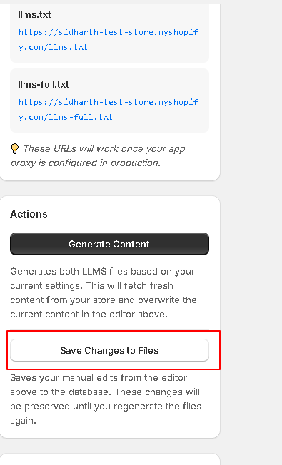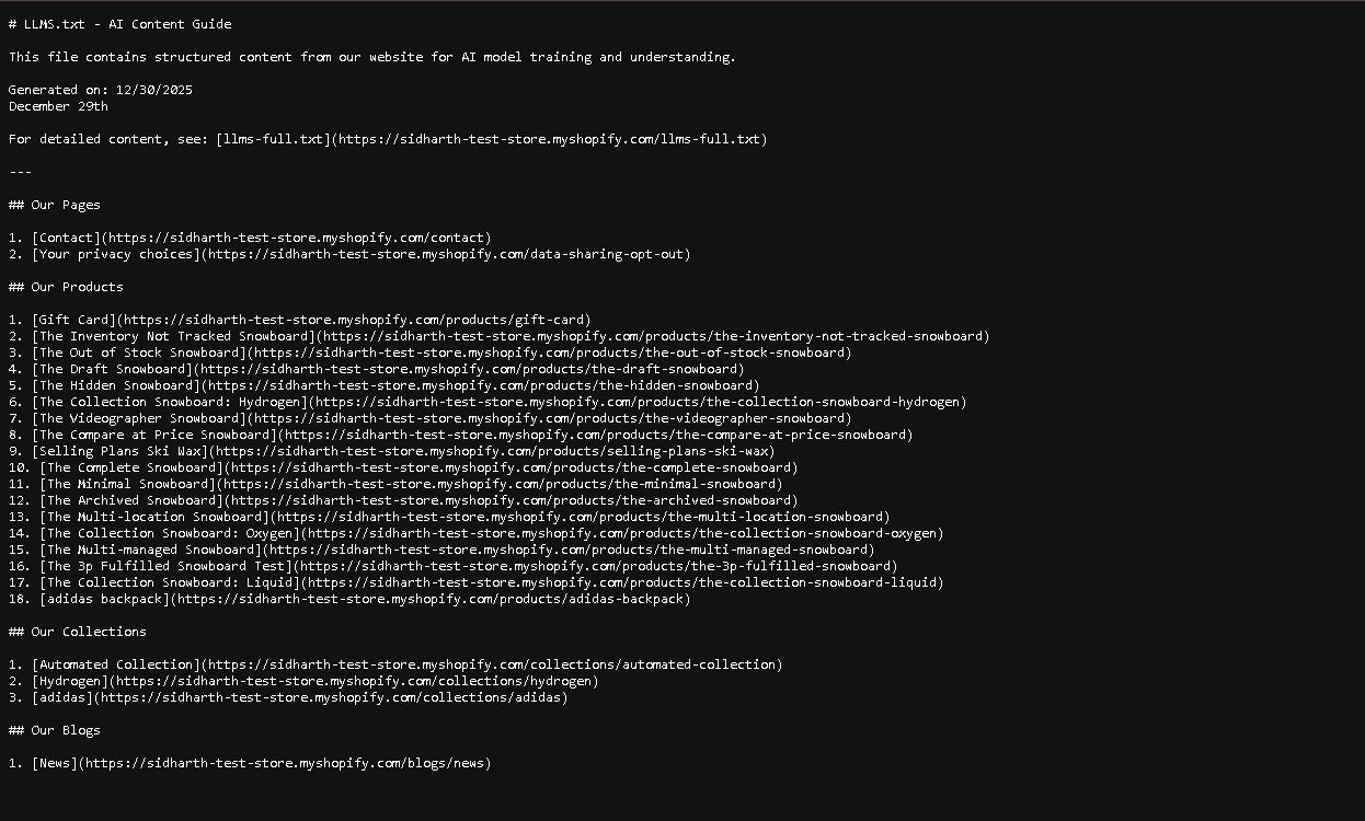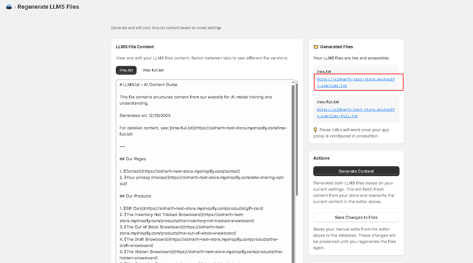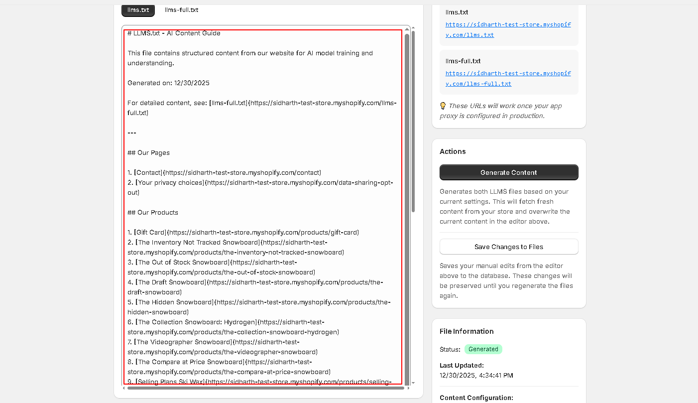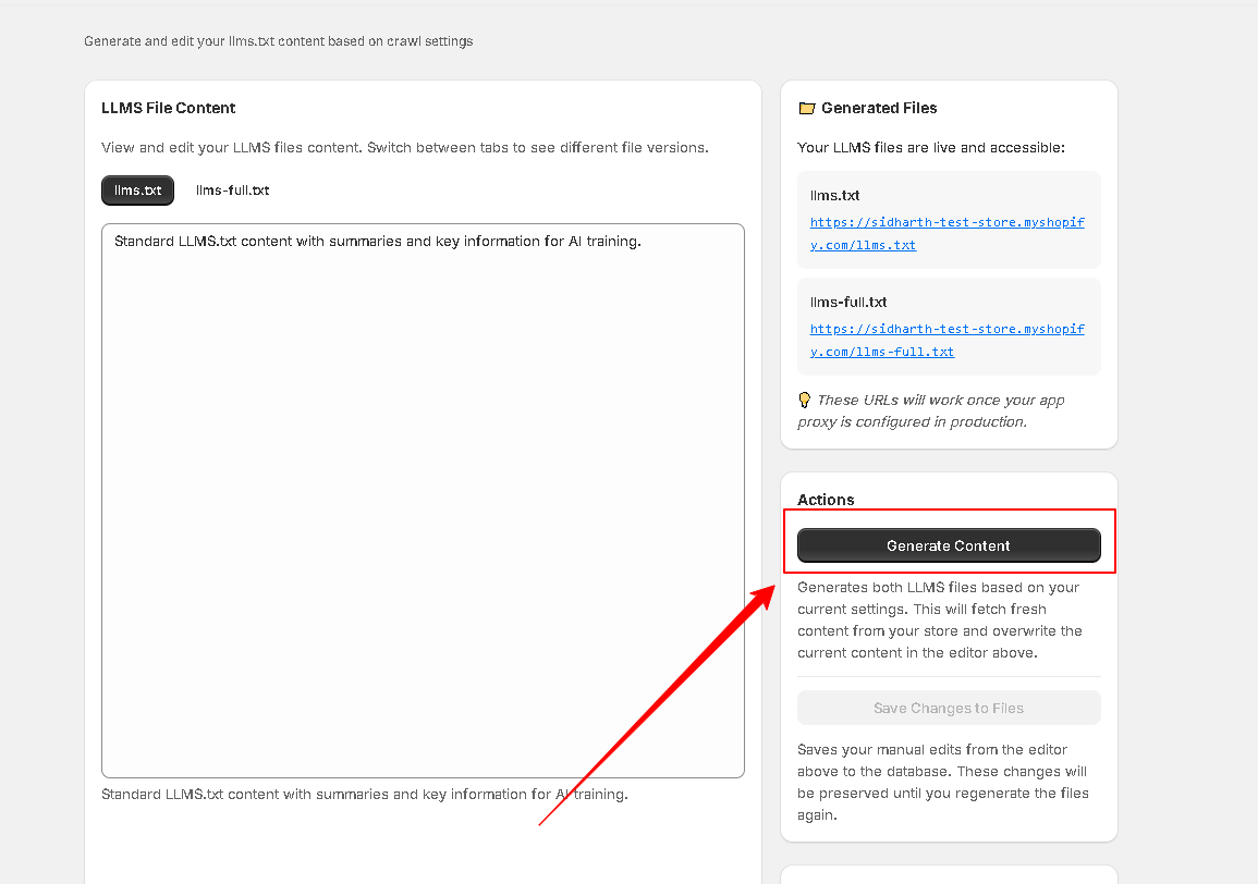 Now click on to the Generate Content button to crawl the data and generate the llm.txt contents.