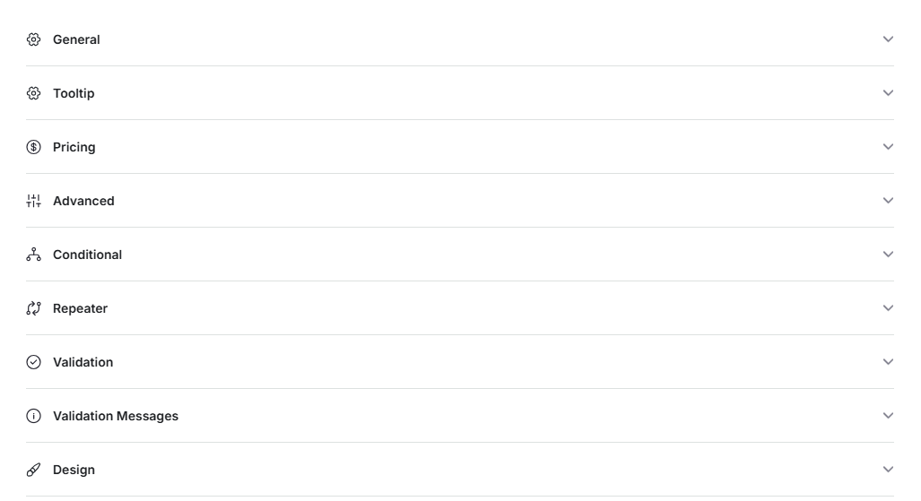 In general settings, you have the option to select validation type as total selected options, sum of field values, total quantity or custom formula. Then you can Select fields to validate as Group Validation or External Field. If you choose external field validation, you have to add the label/tag of the field. Then you can add a minimum value and a maximum value.