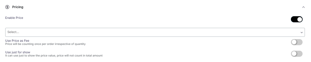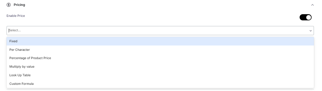Enable price: Enable this option to set the price for the text field. Below are the various available pricing types.