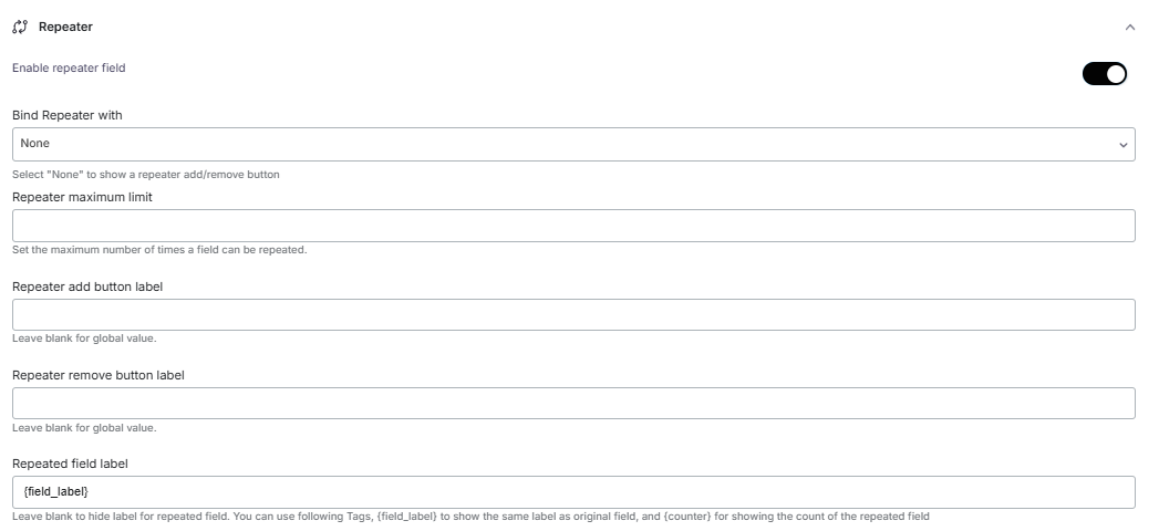 Enable repeater: Enable this field to repeat the field.