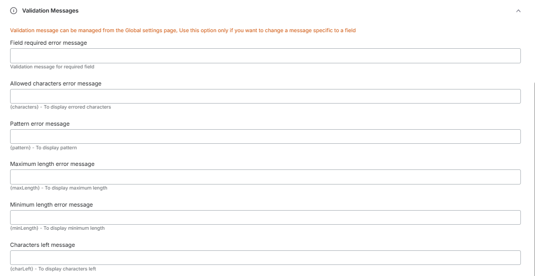 Validation messages can be also managed from the Global settings page. Use this option only if you want to change a message specific to a field.