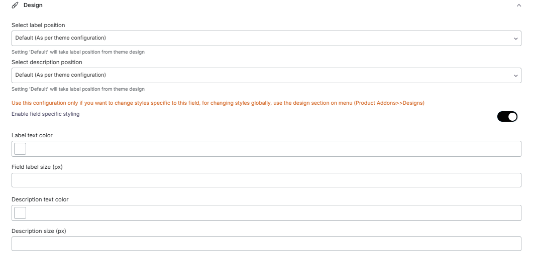 Enable field-specific styling: Enable this to change the label text color, label size, description text color, and description size.