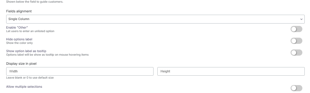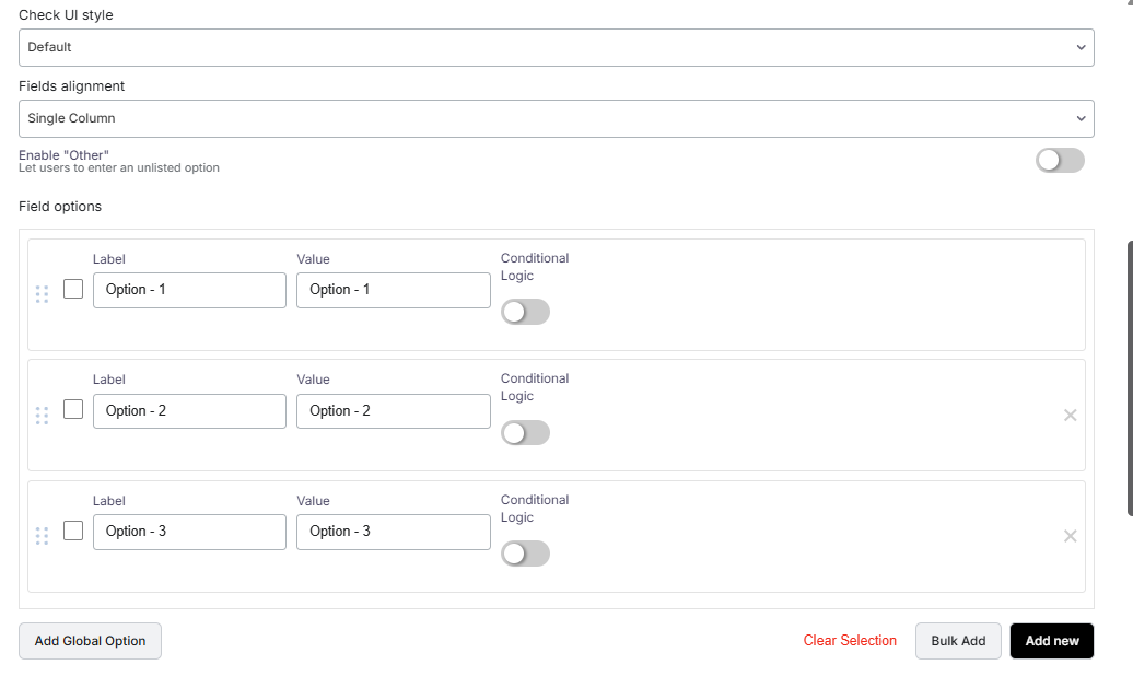 In the general settings, you can choose the checkbox style (Default, Toggle, or Button), and the alignment (single column, inline, 2 columns, 3 columns, or 4 columns). The “ EnablingOther ” option lets users add an unlisted option.