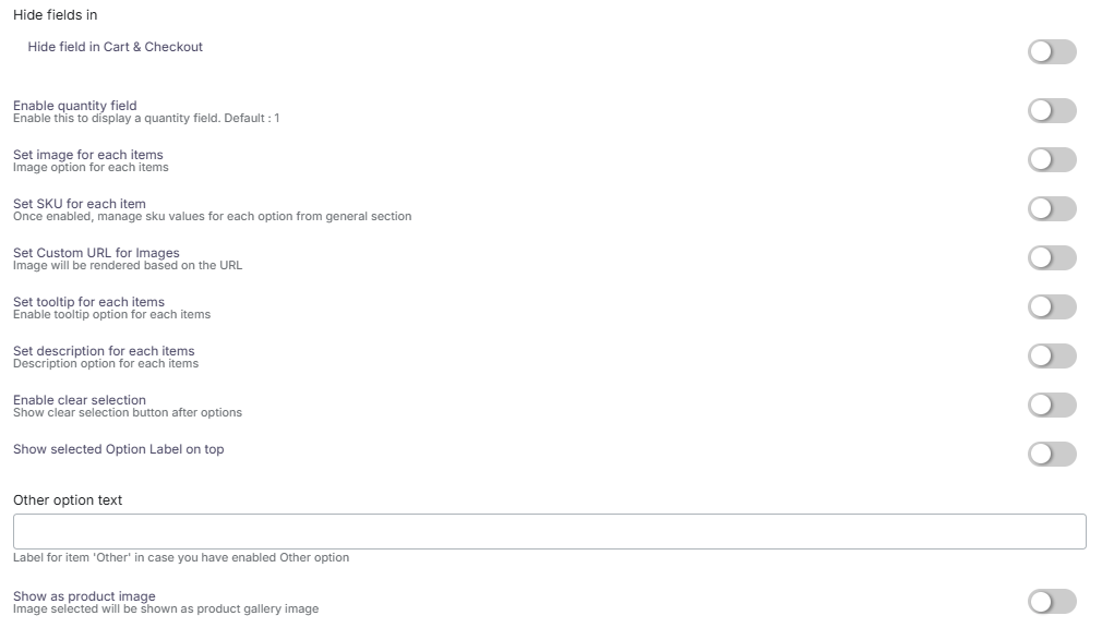 The advanced settings include the option to enable the quantity field, Set a tooltip for each item, Set a description for each item, Enable a clear selection button, Show the selected Option Label on top and you can add the Other option text.