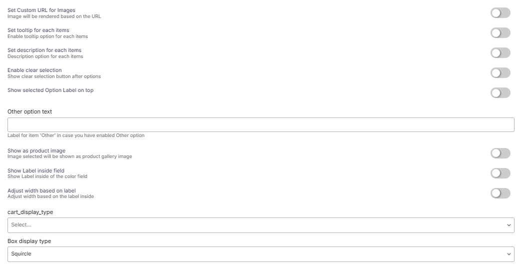 In advanced settings, you can choose how color items are selected—either with a tick, border or tick with a border. You also have the option to display labels inside the field and adjust the width based on the label. The cart display type can be changed to text mode or box mode, and the box display type can be changed to square, circle, or squircle.