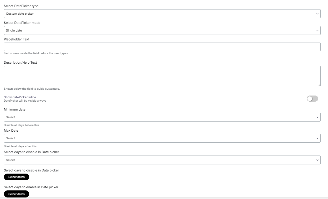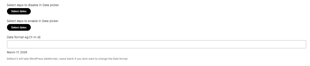 In the general settings, you can choose the date picker type as Custom date picker or basic-browser default type. Additionally, you can select the date picker mode as a single date, multiple dates, or date range.