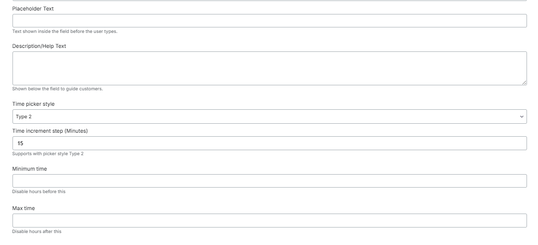 This field is for choosing both date and time. The settings for both the date field and time field are the same.