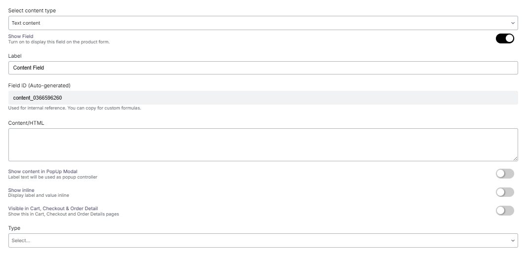 Here are the types of fields on the product addon, along with brief descriptions for each.