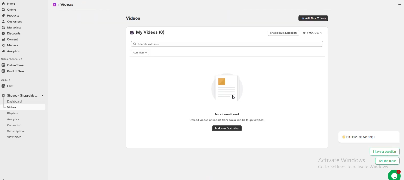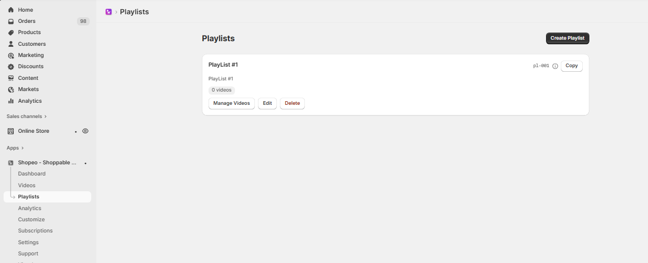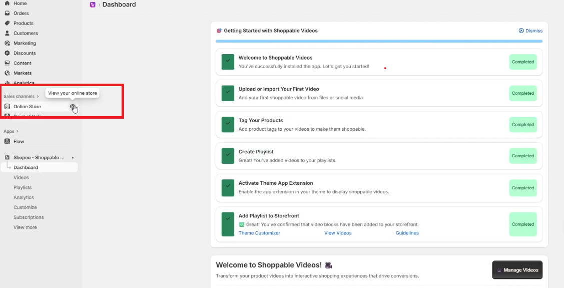 The Shopeo App Dashboard will now be accessible from your Shopify → Apps section, where you can start uploading videos, creating playlists, and configuring settings.
