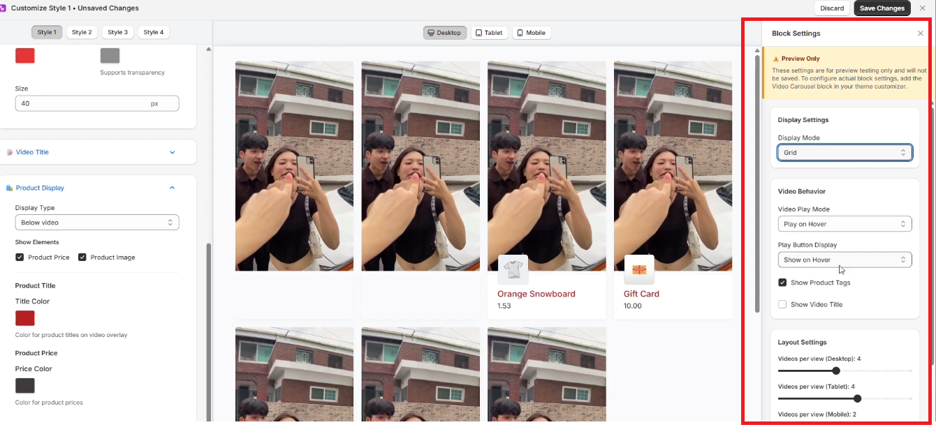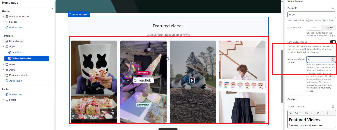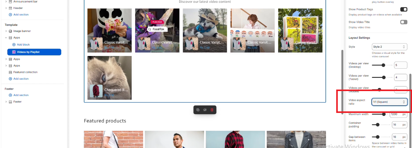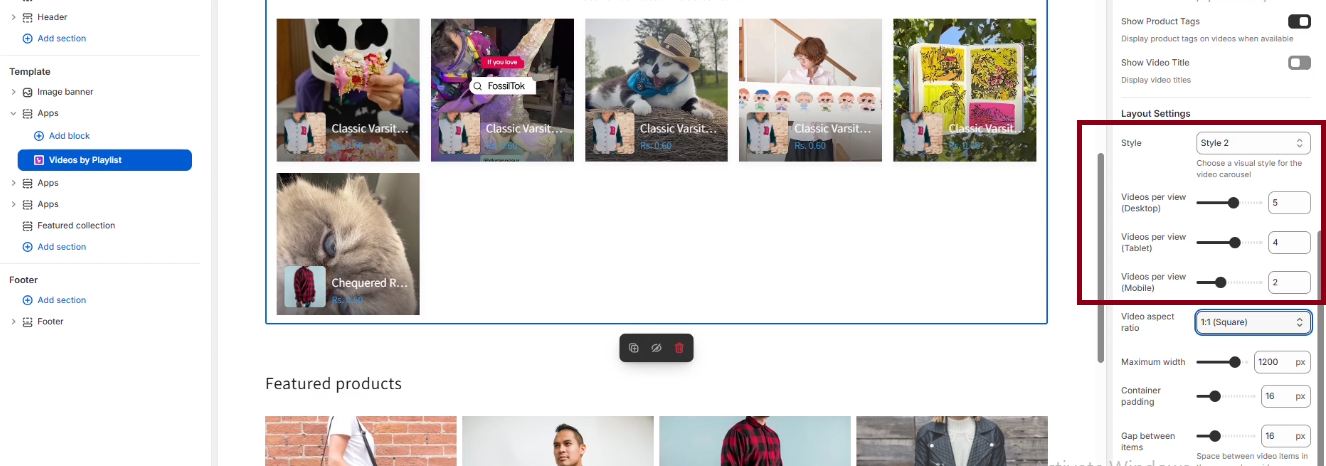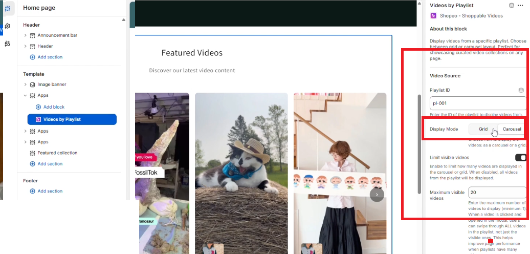 The Shopeo app gives you full control over how your videos appear on your storefront. You can adjust layout, visibility, style, and behavior to match your design preferences.