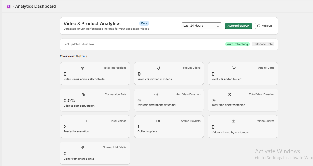 The Analytics section provides a complete overview of how customers interact with your shoppable videos. These real-time insights help you understand performance, engagement, and conversions