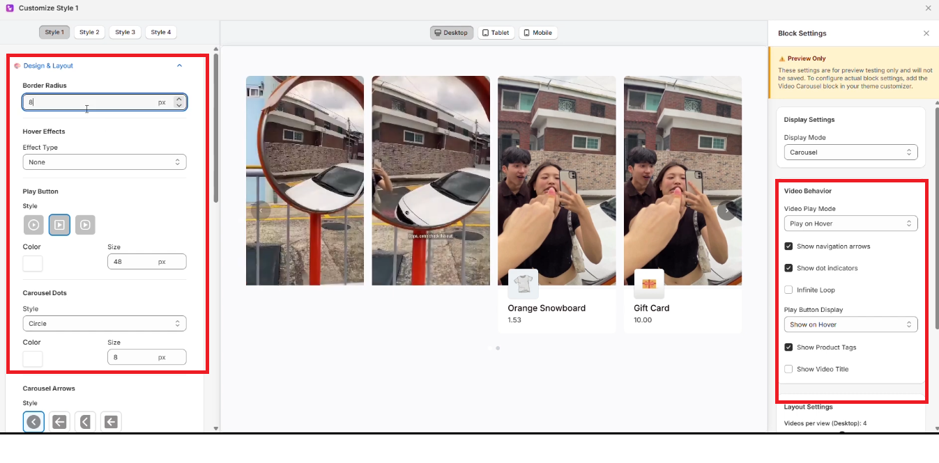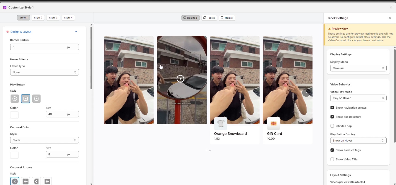 You can explore the different styles and make changes as needed. You can customize the playlist icon, carousel dots, arrows, product display styles, and more.