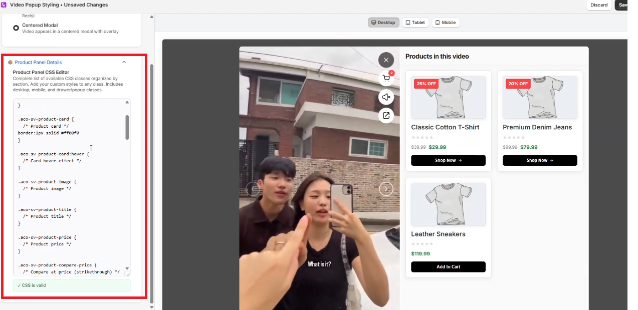 For advanced customization, you can modify the CSS of the product panel directly within the style settings.