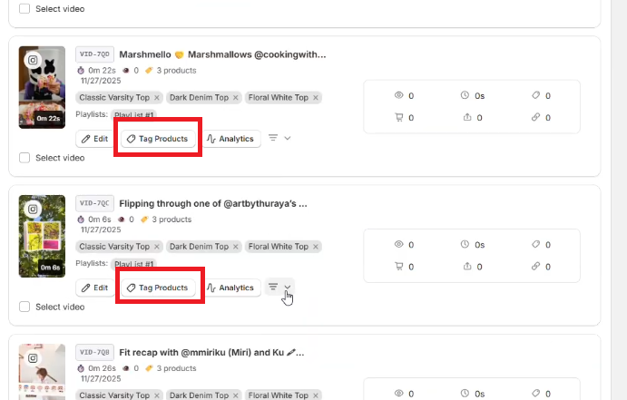 If you want to tag products for each video separately: