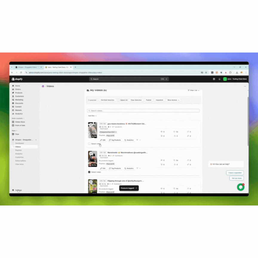 Product tagging allows you to link Shopify products to your videos so customers can shop directly while watching. You can tag products in bulk or individually depending on your needs.